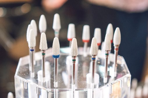 A bit is the term used for the abrasive part of the electric file or e-file. There are many different types and levels of abrasiveness. Each has a specific role in the use of the e-file. They are also available for left and right handed people. They are classed as a metal tool and should be hygienically cleaned as with all reusable metal tools.