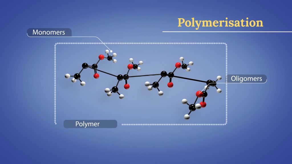 Oligomers Small chains of monomers – which like monomers, themselves, can be the building blocks of polymers and the polymerisation process.