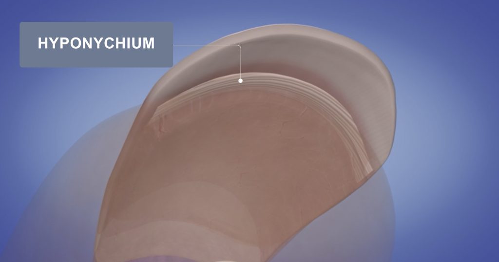 The hyponychium, located beneath the free edge of the nail plate at the distal edge of the finger, plays a critical role in protecting the nail unit. This structure forms (together with the onychodermal band) a tight seal that prevents the entry of harmful bacteria, allergens, and pathogens into the delicate areas of the nail, such as the nail bed and matrix. By acting as a barrier, the hyponychium ensures the overall health and integrity of the nail unit. The hyponychium is one of the 4 Guardian Seals of the nail unit.
